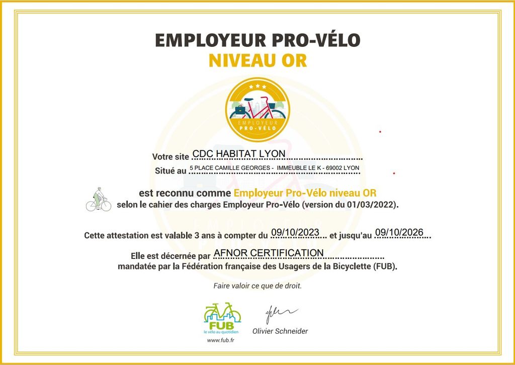 CDC Habitat s’est également porté acquéreur de deux vélos électriques afin d’inciter celles et ceux qui le souhaitent à les utiliser également dans le cadre de leurs déplacements professionnels notamment vers les résidences du patrimoine. Un ensemble d’actions qui n’a pas échappé à l’AFNOR, mandaté par la fédération française des usagers de la bicyclette, qui a audité le siège en octobre dernier et attribué à CDC Habitat le label « Employeur Pro-Vélo » niveau Or pour une durée de 3 années – la plus haute labellisation possible. Les actions vont se poursuivre en 2024 avec des actions prévues pour inciter toujours plus de personne à adopter ce mode de transport.